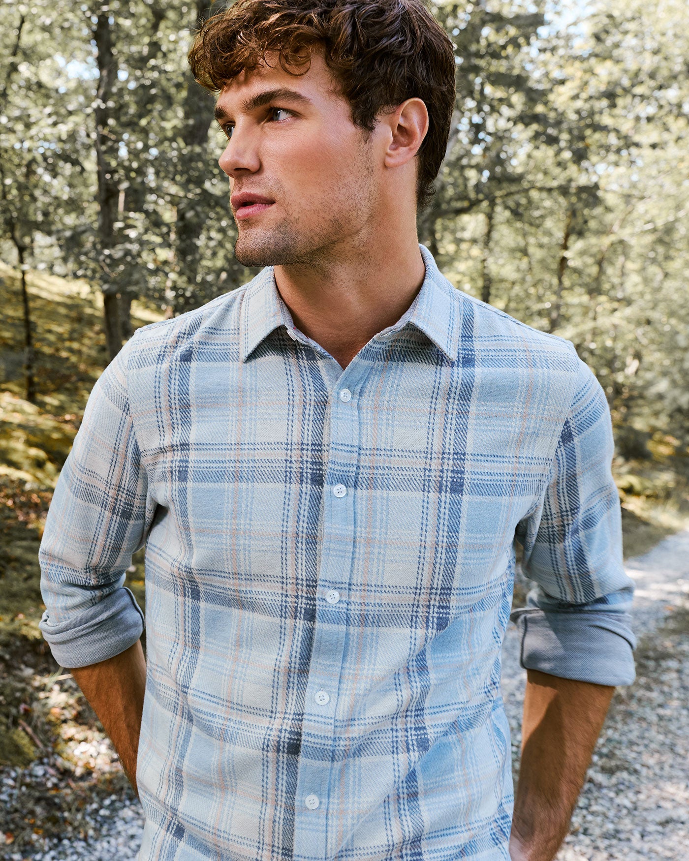 With a blend of extremely soft and stretchy knit performance fabric, you’ll find yourself reaching for this fall favorite all season long. Layer over your favorite tees, or on its own– this endlessly versatile flannel can be worn anytime, anywhere. Contrast fabric inside collar stand, back yoke, front placket, and sleeve cuffs. Single front chest pocket; button closures. Tailored athletic fit.